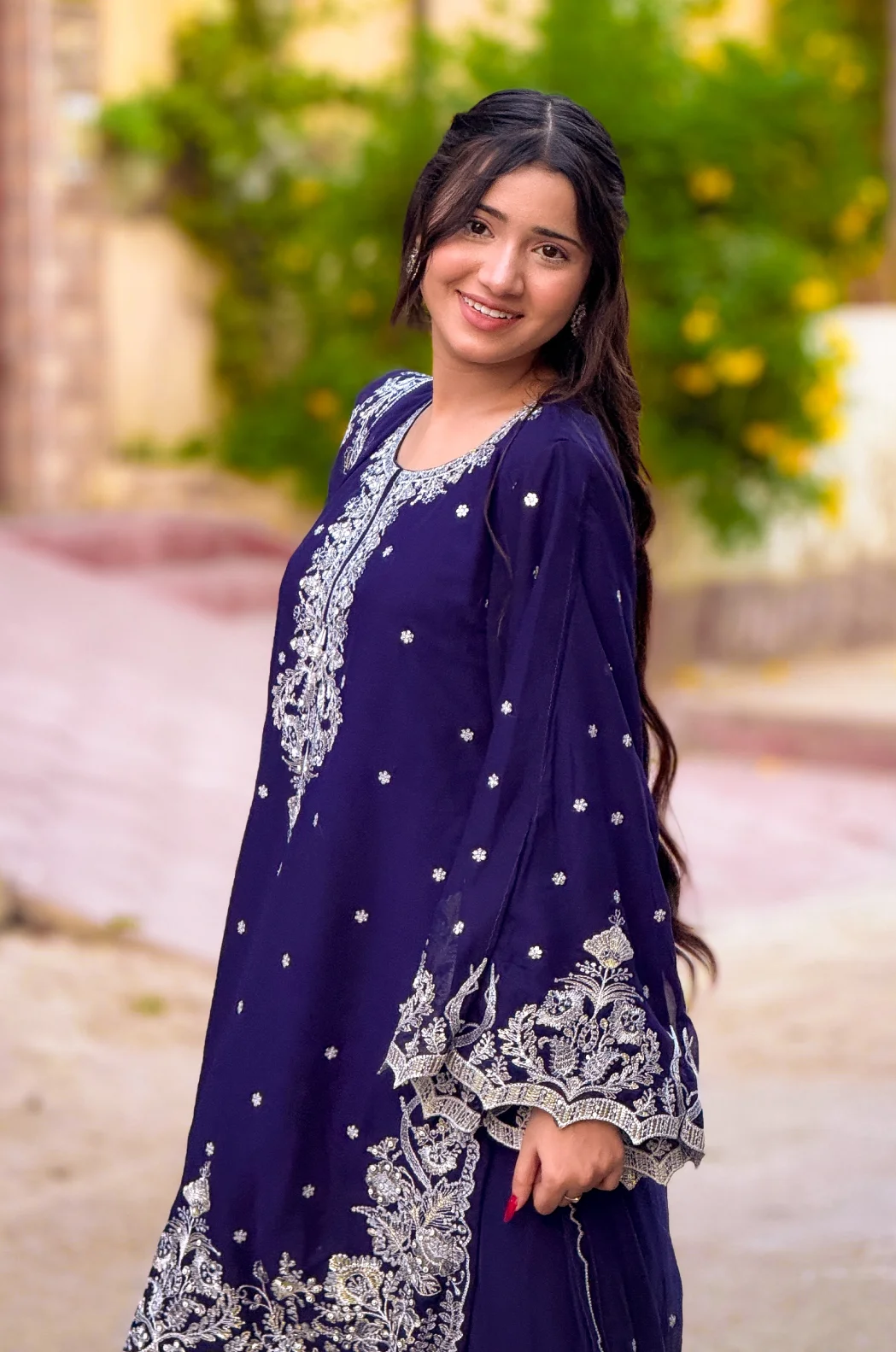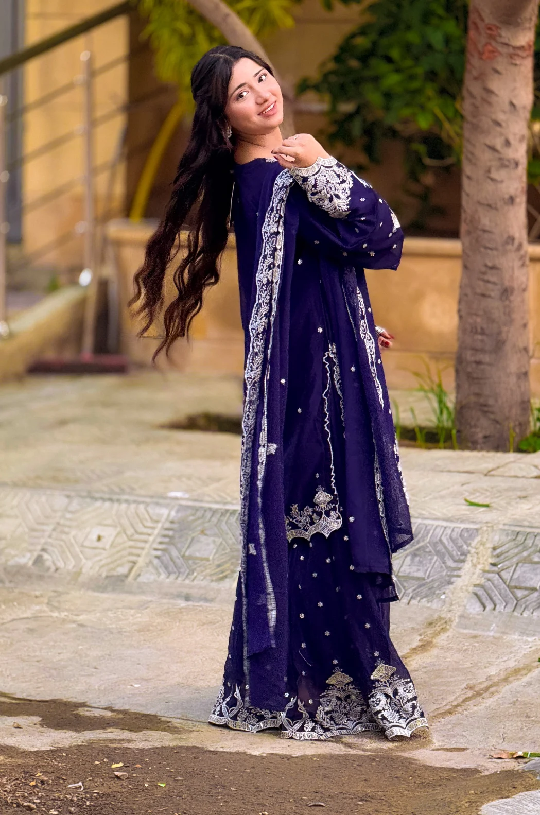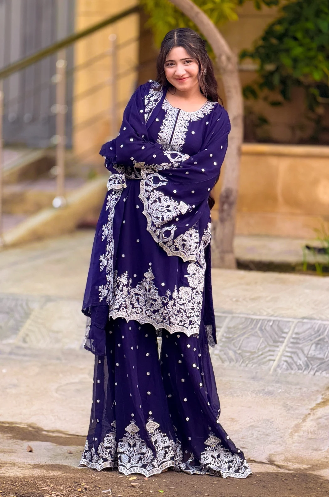 Presenting Sajal in Zinc Blue hue by Inaaya Fashion , the allure of the of the hand embroidery on neck panel and bottom of the shirt. Embroidered sleeves increase the charm of the outfit pair with Gharara on and the delicate chiffon embroidered dupatta.