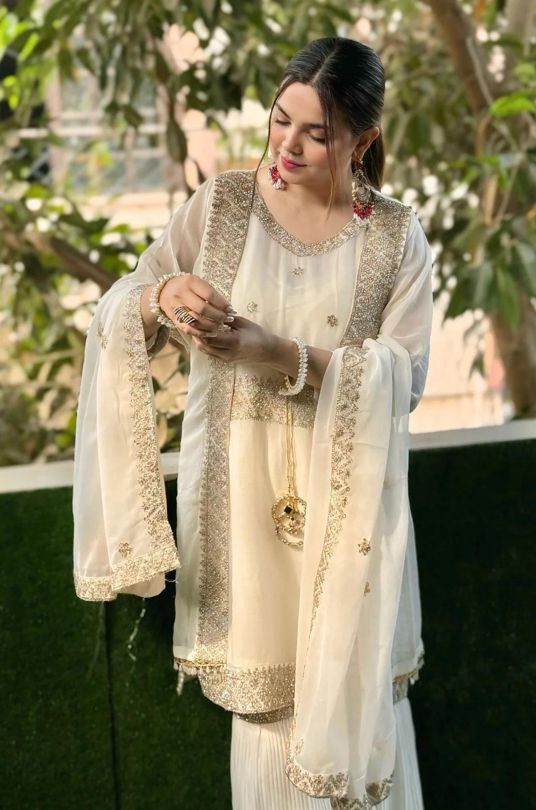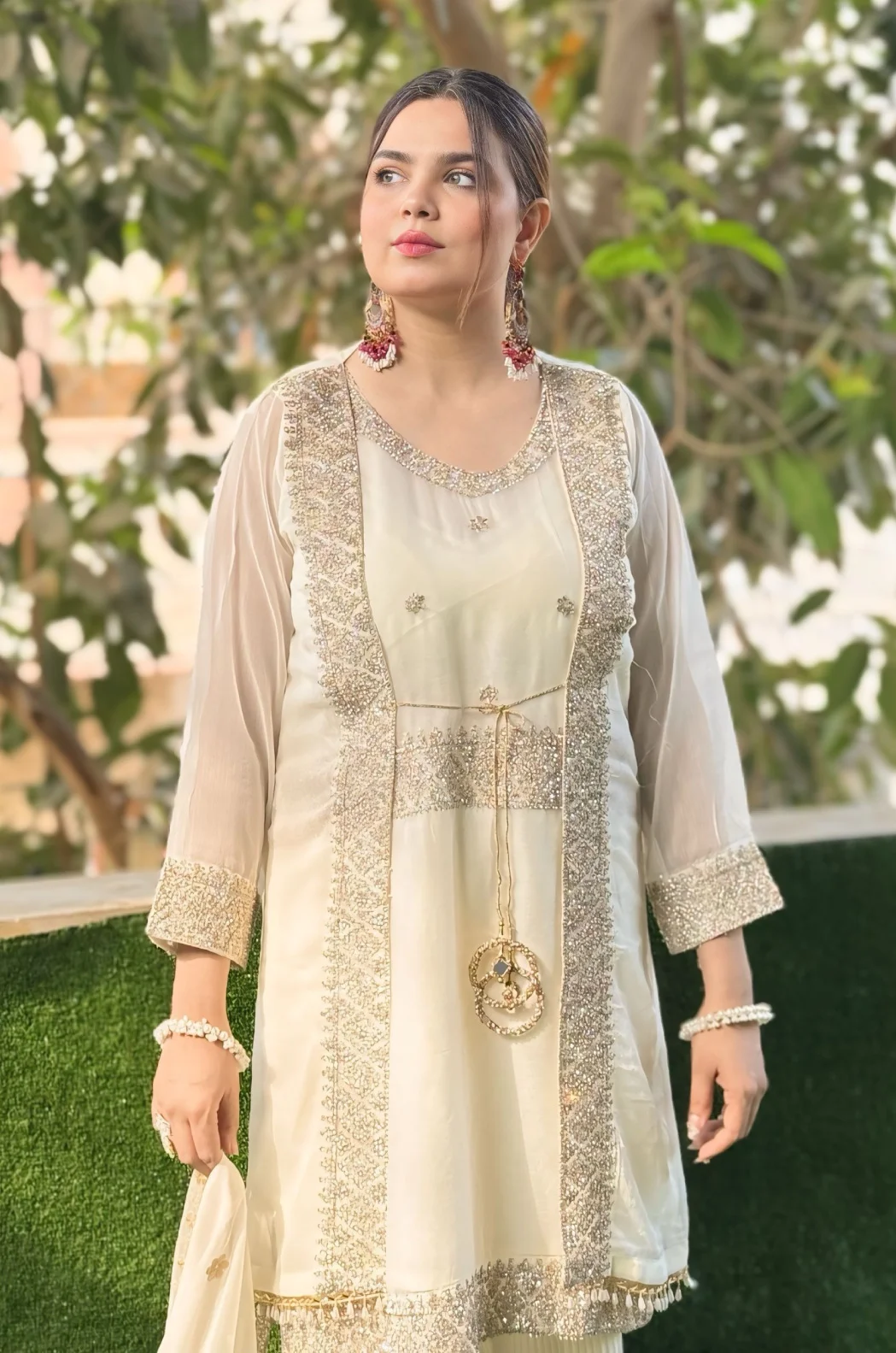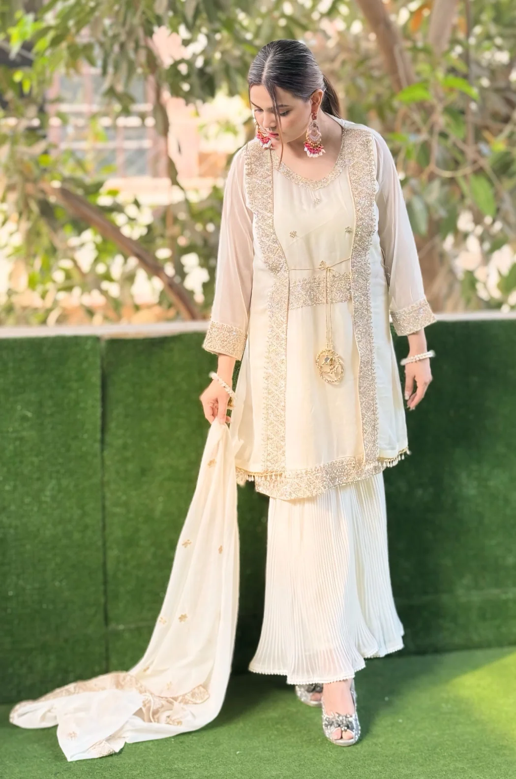 Additional Description: This exquisite Festive/Party Wear Gharara set features an off-white chiffon gown with intricate embroidery. The straight leg Gharara bottom and chiffon dupatta add a touch of elegance, perfect for all seasons. The delicate embellishments and luxurious fabrics make this outfit a standout choice for any special occasion. Brand: Inaaya Fashion.
